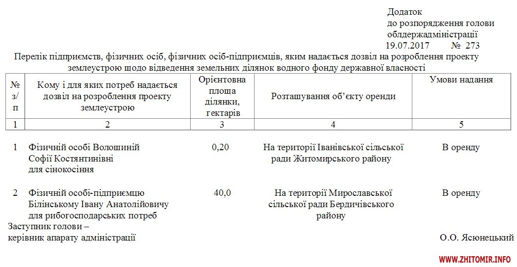 Житомирська облдержадміністрація надала п’яти суб’єктам господарювання дозволи на розроблення проектів землеустрою щодо відведення земельних ділянок водного фонду, технічної документації щодо встановлення (відновлення) меж земельних ділянок водного фонду в натурі (на місцевості), укладання договору оренди водного об’єкта у комплексі із земельною ділянкою.