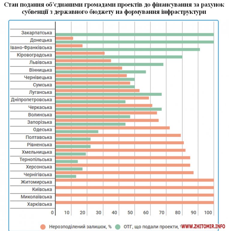 «З 366 ОТГ, які цього року отримують інфраструктурну субвенцію, проекти подали поки 125. Комісія схвалила 553 з поданих ОТГ проектів на загальну суму близько 450 млн грн. Найбільш активними є об’єднані громади Закарпатської області – там вже подали проектів на 100% суми субвенції. Майже розподілили кошти субвенції ОТГ Донецької (залишок 11%) та Івано-Франківської (залишок 17%) областей. В аутсайдерах чотири області: Житомирська, Київська, Миколаївська та Харківська. Від ОТГ цих областей проектів до Мінрегіону поки взагалі не надходило», - йдеться у повідомленні.