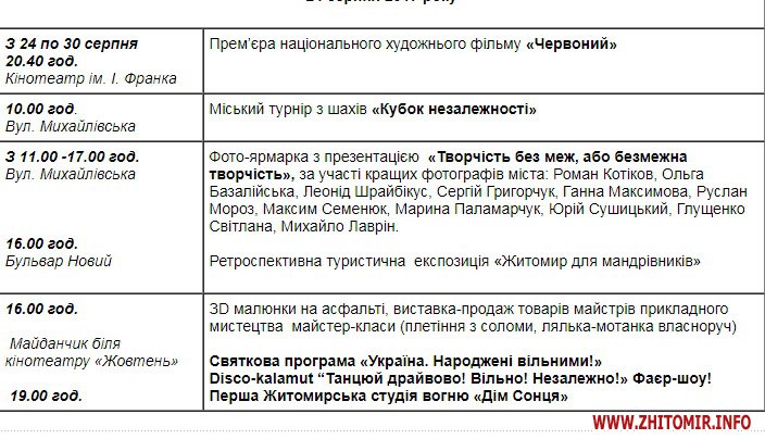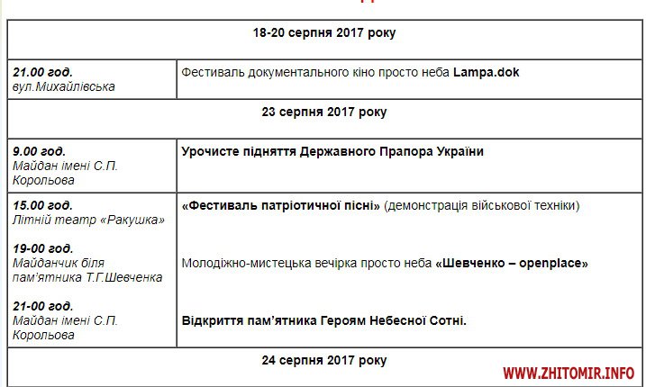«День Державного Прапора України, 23 серпня, розпочнеться із підняття стягу на майдані ім. С.П.Корольова із 09.00 ранку. О 21.00 годині 23 серпня – довгоочікуване відкритття пам’ятника Героїв Небесної Сотні. Висота скульптури – понад 3 метри, а висота триптиху – близько 8 метрів (два поверхи фасаду будівлі). Вночі композиція підсвічуватиметься. 24 серпня у Житомирі відбудеться прем’єра національного художнього фільму «Червоний», а впродовж дня на всіх бажаючих чекає святкова програма «Україна. Народжені вільними» у різних локаціях міста», - інформує ОДА.