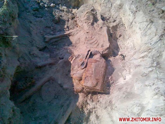 «Надвечір 20 серпня до Малинського відділення поліції надійшло повідомлення від 53-річного жителя с. Лумлі про виявлення людських решток. На місці події поліцейські з’ясували, що заявник досліджував околицю села у пошуках старовинних речей. На полі за сотню метрів від одного з будинків почав розкопувати ділянку і наткнувся на металеві іржаві речі, схожі до військової амуніції – каску, протигаз, частини гвинтівки, а потім - на скелет людини», - інформують у поліції.
