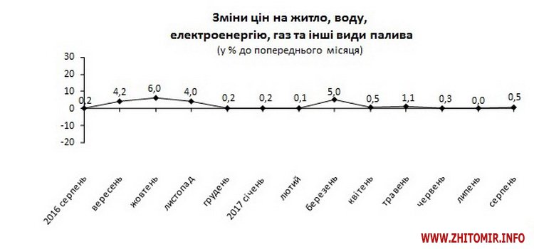 «На продовольчому ринку у серпні 2017 р. ціни на продукти харчування та безалкогольні напої зросли на 0,2%. Алкогольні напої, тютюнові вироби зросли в ціні загалом на 0,9%, зокрема, тютюнові вироби – на 2,4%. Ціни (тарифи) на житло, воду, електроенергію, газ та інші види палива піднялися на 0,5% внаслідок подорожчання квартирної плати на 9,4%, утримання та ремонту житла – на 1,1%. Підвищення цін на 0,3–0,2% зафіксовано у сфері транспорту, освіти, охорони здоров’я. Також подорожчали послуги ресторанів та готелів на 1,7%, натомість одяг і взуття подешевшали на 3,1%, зокрема, взуття – на 6,1%», - повідомляють статистики.
