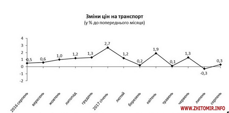 Ціни на споживчому ринку Житомирської області у серпні 2017 року порівняно з попереднім місяцем зросли на 0,2%, з початку року – на 7,5%, по Україні порівняно з попереднім місяцем знизились на 0,1%, з початку року зросли на 8,1%.