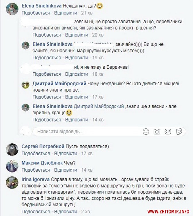 У соцмережі Facebook бердичівляни пишуть, що для одних проїзд у маршрутці 5 грн сьогодні став неочікуваним, інші – вірили в краще.
