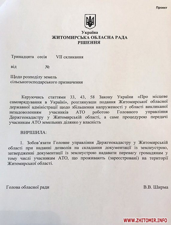 «Виконую свою обіцянку перед учасниками АТО – щодо розподілу земель сільськогосподарського призначення. Моя принципова позиція, яку подам на розгляд депутатів обласної ради як проект рішення. Маємо зобов’язати ГУ Держгеокадастру в області при оформленні документації із землеустрою надавати перевагу громадянам, що проживають на території Житомирської області. Звичайно, у пріоритеті – учасники АТО! Сподіваюся, що депутати і бійці АТО це підтримають», - написав Гундич і прикріпив офіційний лист до облради щодо винесення на сесію проекту рішення про розподіл земель та сам проект рішення.