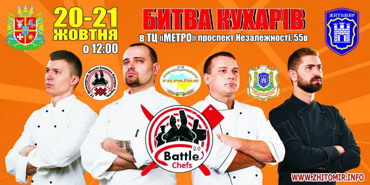 20-21жовтня у Житомирі відбудеться ІІ відкритий житомирський обласний чемпіонат кулінарного мистецтва та сервісу «Battle Chefs 2.0». Впродовж двох днів кулінари змагатимуться за кубок голови Житомирської облдержадміністрації.