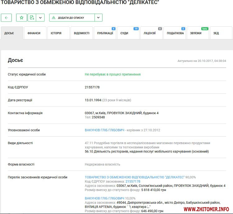 З рішення суду стало відомо, що у 2016 році державний реєстратор вніс до Державного реєстру речових прав на нерухоме майно відомості про право ТОВ «Делікатес» на оренду 216,5 га землі (кадастровий номер 1820880900:16:000:0009)вартістю 6,6 млн грн, що у Бердичівському районі.