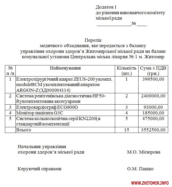 З балансу управління охорони здоров’я Житомирської міської ради на баланс комунальної установи «Центральна міська лікарня № 1» та комунальної установи «Центральна міська лікарня № 2» планують передати 28 одиниць медичного обладнання загальною вартістю 9 млн 346 тис. 494,35 грн.
