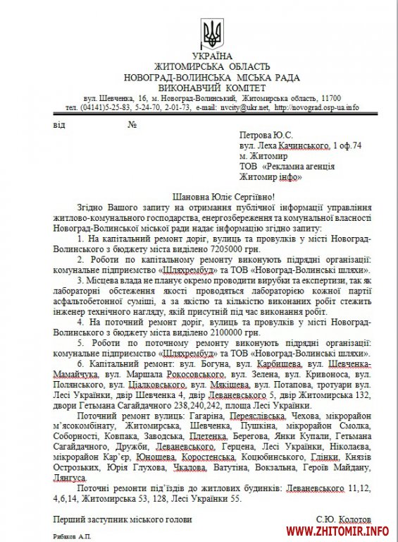Про це у відповідь на запит Житомир.info повідомляє Новоград-Волинська міська рада.
