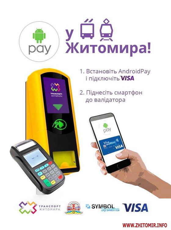 «Ми постійно працюємо над тим, аби зробити для пасажирів безготівкову оплату проїзду максимально зручною. Android Pay - черговий і не останній сервіс, яким можна платити у транспорті за допомогою смартфону з безконтактним чіпом. Зараз для цього потрібно встановити програму, додати картку Visa та при вході піднести телефон до валідатора» - повідомив Іван Фурлет, директор КП «Житомиртранс».