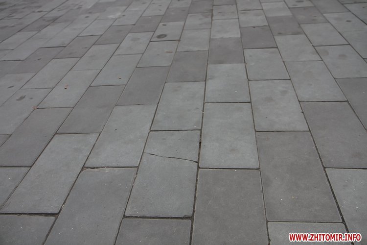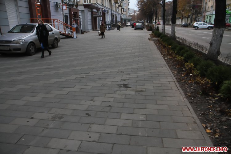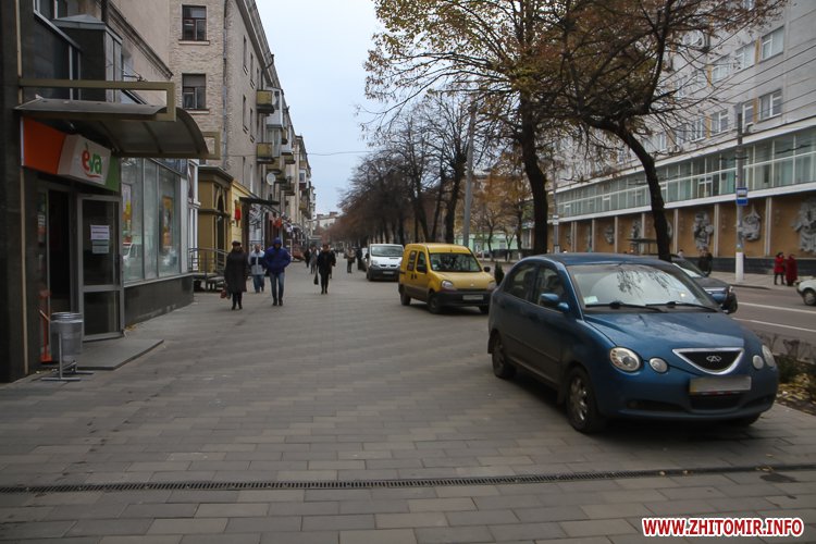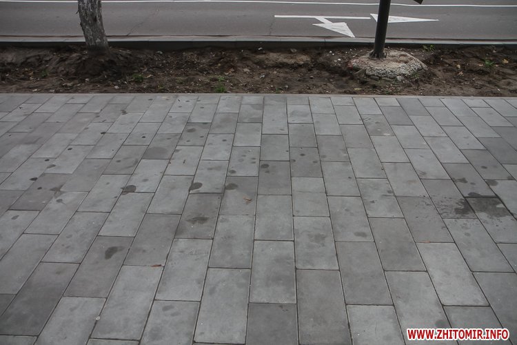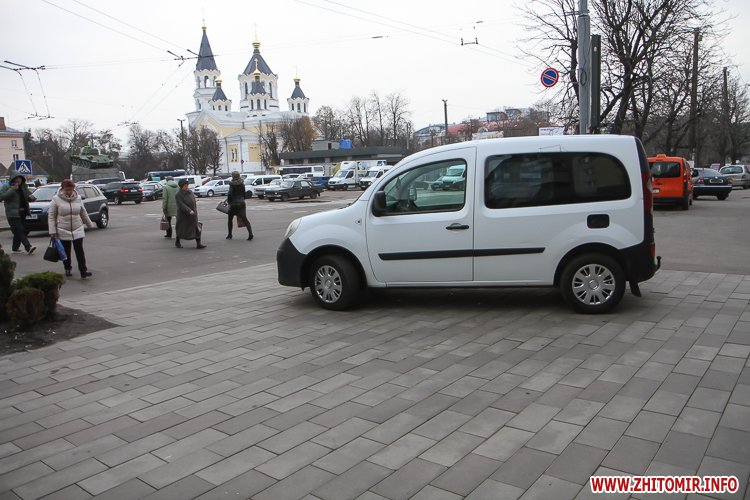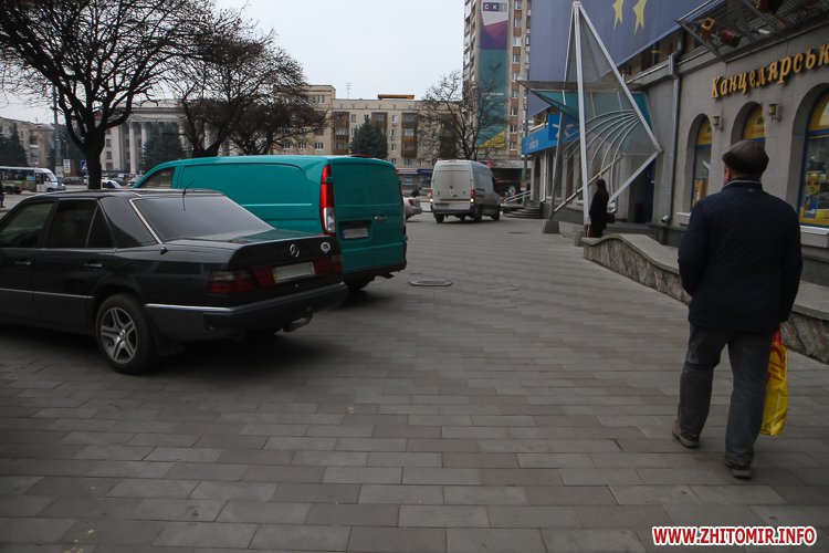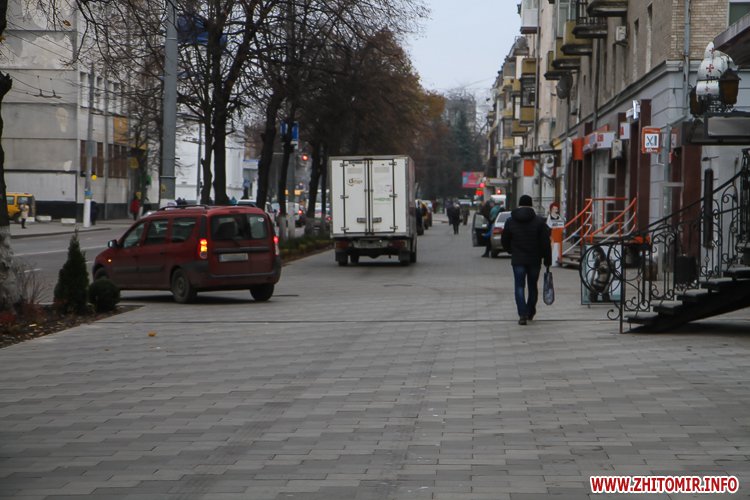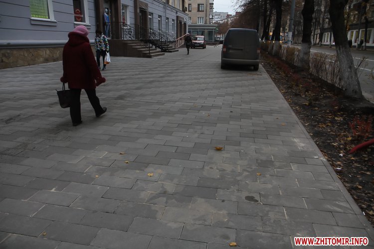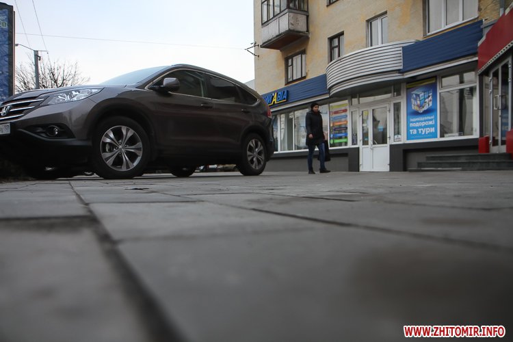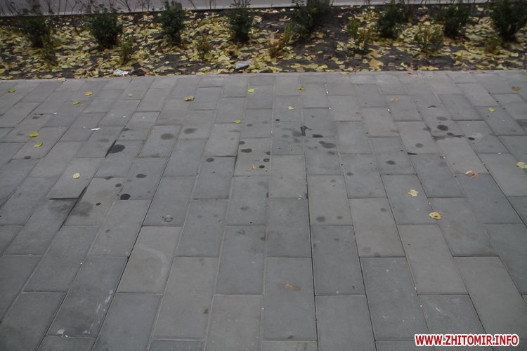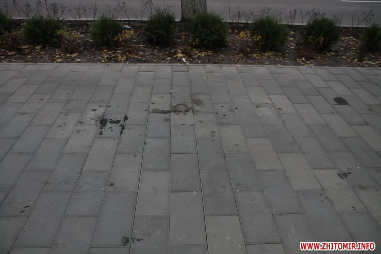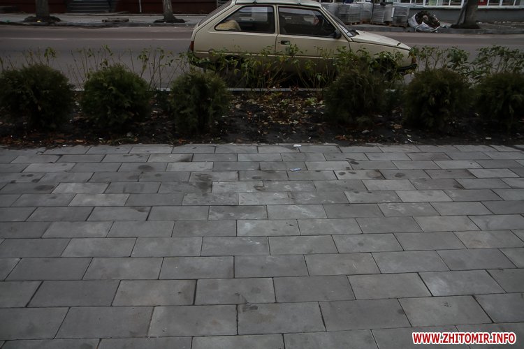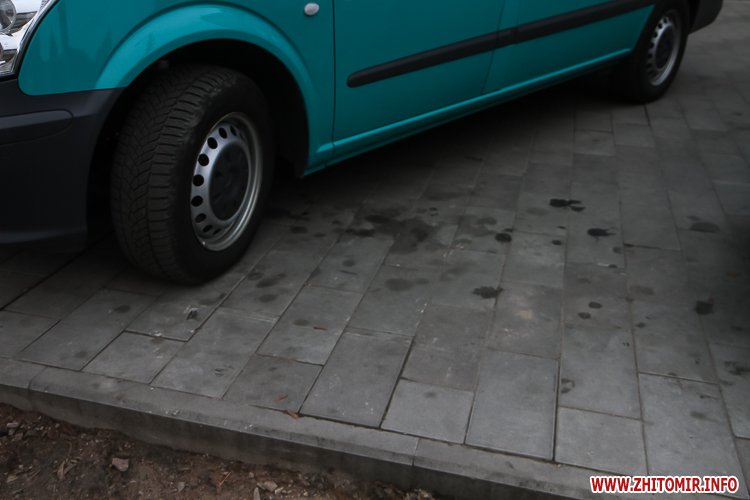 В центрі Житомира влаштовують автостоянки на новій тротуарній плитці, через що вона просідає та вкривається масними плямами.