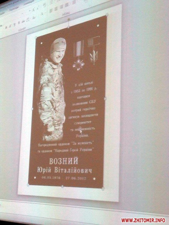 Виконком дозволив встановити на фасаді школи №16 у Житомирі меморіальну дошку загиблому в АТО полковнику СБУ Юрію Возному.