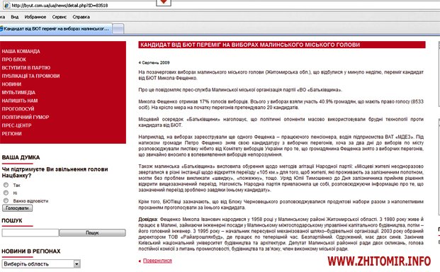 На этом скандал не заканчивается, поскольку на сайте БЮТа также обнаружилось поздравление господину Фещенко. В нем утверждается, что эту кандидатуру привела к власти в Малине именно эта политическая сила... Так чей же мэр? Или, как всегда, слуга двух господ?