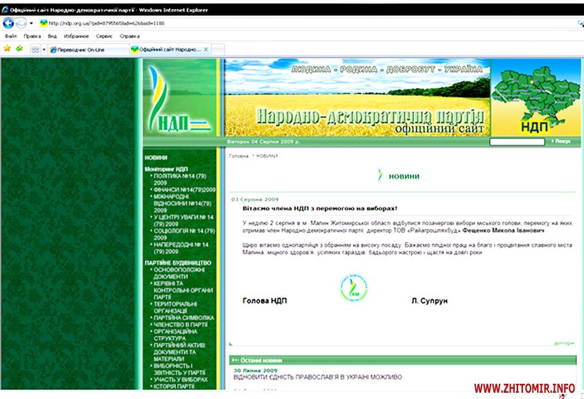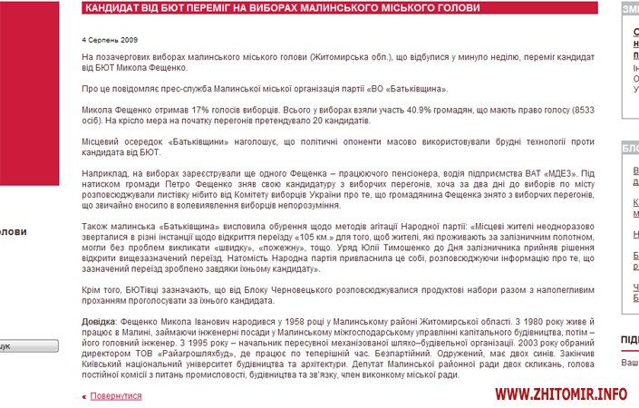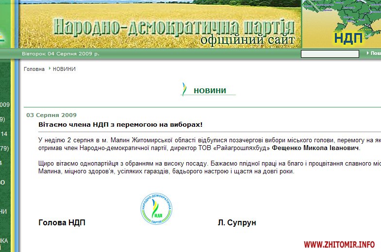 Вот ее прямая речь: «В воскресенье 2 августа в г. Малин Житомирской области состоялись внеочередные выборы городского головы, победу на которых одержал член Народно-демократической партии, директор ООО «Райагрошляхбуд» Фещенко Николай Иванович.