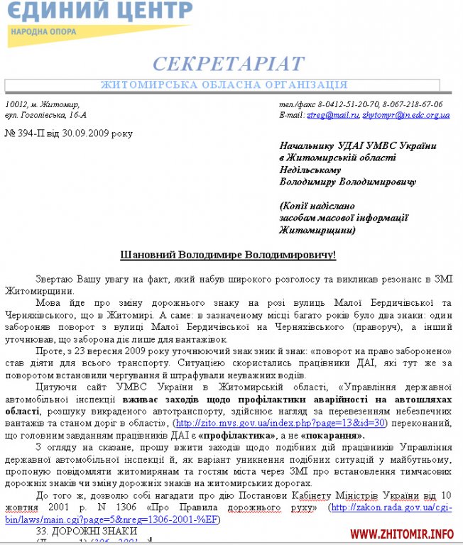 В распоряжении Житомир.info находится открытое письмо руководителя секретариата Житомирской областной организации политической партии «Единый Центр» Руслана Годованого, адресованное руководителю Госавтоинспекции в Житомирской области Владимиру Недельскому, в котором автор обращает внимание на факт использования сотрудниками ГАИ ситуации после изменения знаков в центре города на перекрестке улиц Малой Бердичевской и Черняховского.