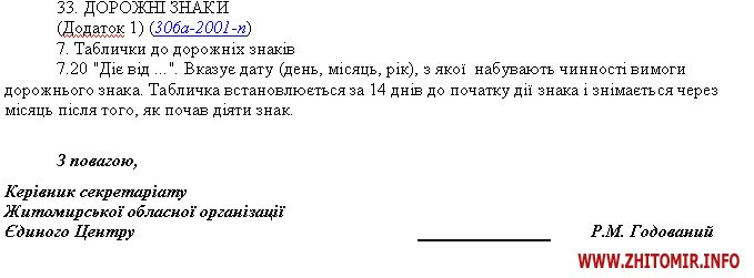 7.20 "Действует от ...". Указывает дату (день, месяц, год), с которой вступают в силу требования дорожного знака. Табличка устанавливается за 14 дней до начала действия знака и снимается через месяц после того, как начал действовать знак», - цитирует Правила руководитель секретариата Житомирской облорганизации «Единого Центра».