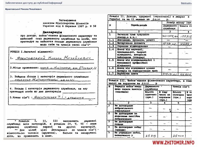Прокурор Житомирской области Николай Франтовский задекларировал за 2010 год 364,6 тыс. гривен доходов: размер заработной платы за прошлый год составил 349,2 тыс. грн., материальная помощь – 15, 4 тыс. грн. Доходы его супруги составили 177,5 тыс. гривен: заработная плата – 166, 8 тыс. грн., материальная помощь – 10,7 тыс. грн.