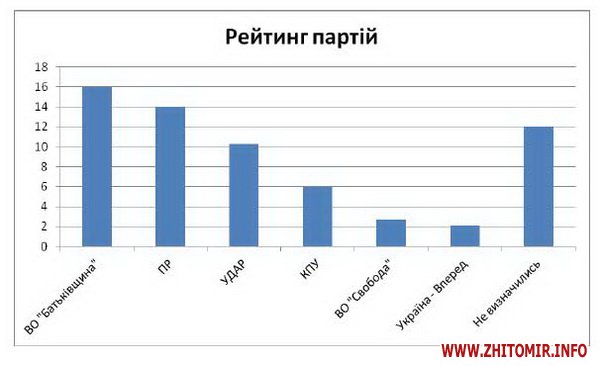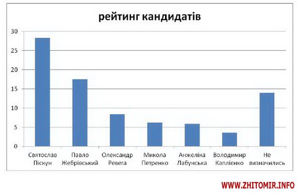 За мажоритарною системою 28,3% виборців віддали б свій голос екс-Генпрокурору Святославу Піскуну, 17,5% екс-губернатору Житомирщини Павлу Жебрівському, 8,4% депутату облради Олександру Ревезі. Кандидат Микола Петренко має підтримку 6,2% мешканців округу, Анжеліка Лабунська 5,9%, Володимир Каплієнко 3,5%. Не визначились 14% виборців, решта на вибори не прийде.