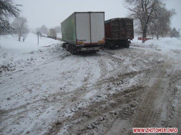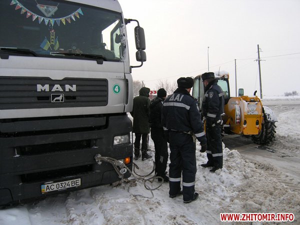 Во время патрулирования на 109 километре трассы Киев - Чоп, в том же Коростышевском районе, дежурный экипаж ГАИ обратил внимание на грузовик, расположившийся в снежном сугробе. Как выяснилось, водителю фуры, который ехал из столицы в Коростышев, была необходима помощь. Мужчина рассказал гаишникам, что еще вечером, когда ехали по трассе, решил пополнить запасы топлива на автозаправочной станции, которая находилась справа автодороги. Он попытался повернуть, но колеса крупногабаритного грузовика с полуприцепом занесло в снежный сугроб. Выбраться из ловушки водителю не удалось даже с помощью других грузовиков.