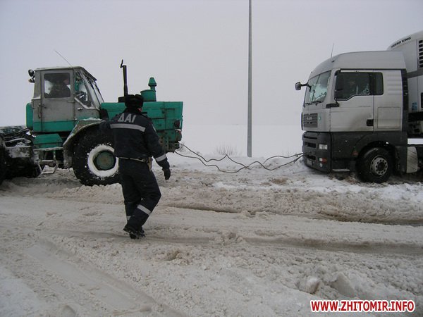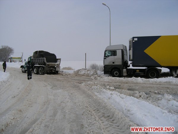 Коростышевский район – далеко не единственный в Житомирской области, где для оказания помощи водителям транспортных средств активно привлекается «тяжелая артиллерия». В Попельнянском районе на участке автодороги Житомир - Сквира постоянно дежурит наряд ГАИ, ведь по этой дороге движутся дальнобойщики. На скользкой дороге груженая фура, как правило, не может преодолеть крутой подъем. Чтобы помочь водителям, на этом участке автодороги, гаишники организовали контроль за постоянной обработкой дорожного полотна песком. Вместе с гаишниками дежурят и дорожные службы, которые имеют в распоряжении спецавтомобили и тракторы, с помощью которых в случае необходимости и проводится спасение крупногабаритного транспорта.