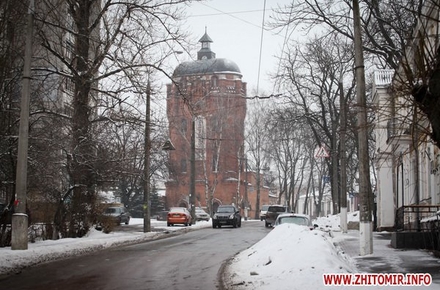 Водонапорная башня. Построена в 1889 году. Одна из самых красивых архитектурных достопримечательностей Житомира. Раньше на верхних этажах башни рассполагалось кафе.