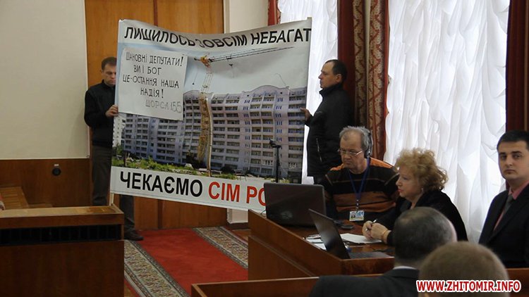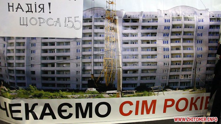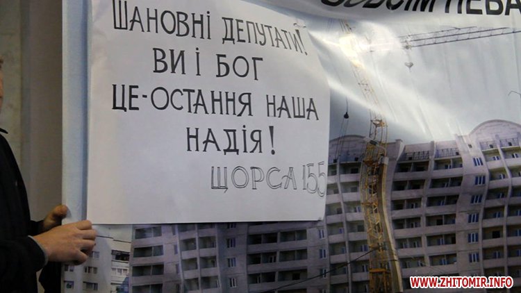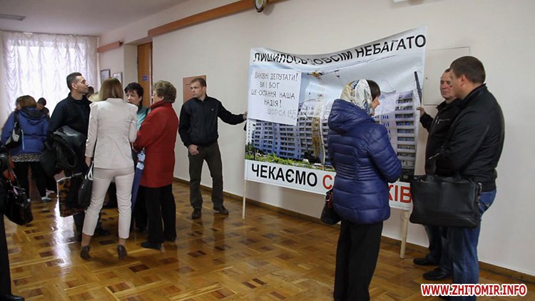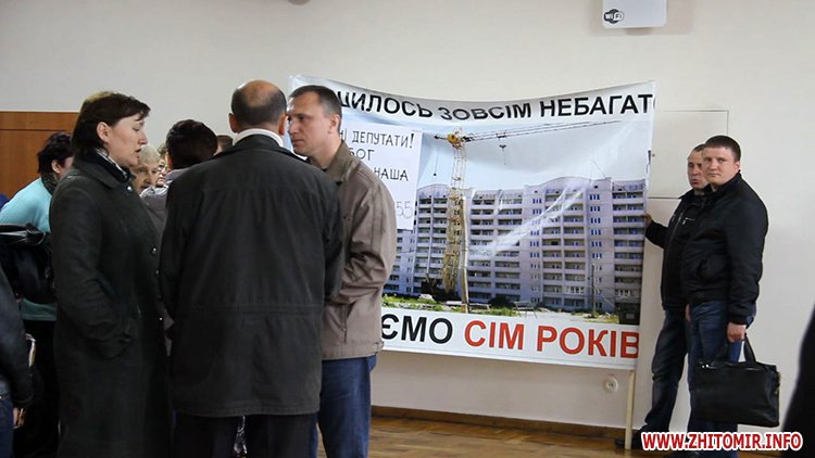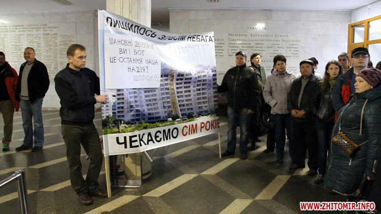 10 квітня кілька десятків людей вийшли пікетувати сесію Житомирської облради. Люди які вклали гроші у зведення багатоповерхівки на Щорса, 155 скаржаться: мали заселитися у квартири ще 7 років тому, але досі змушені чекати.