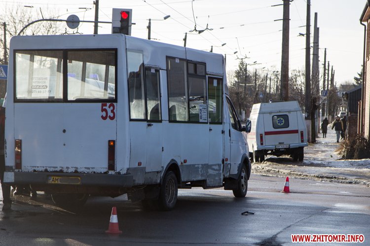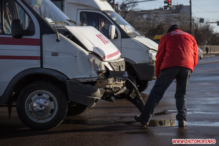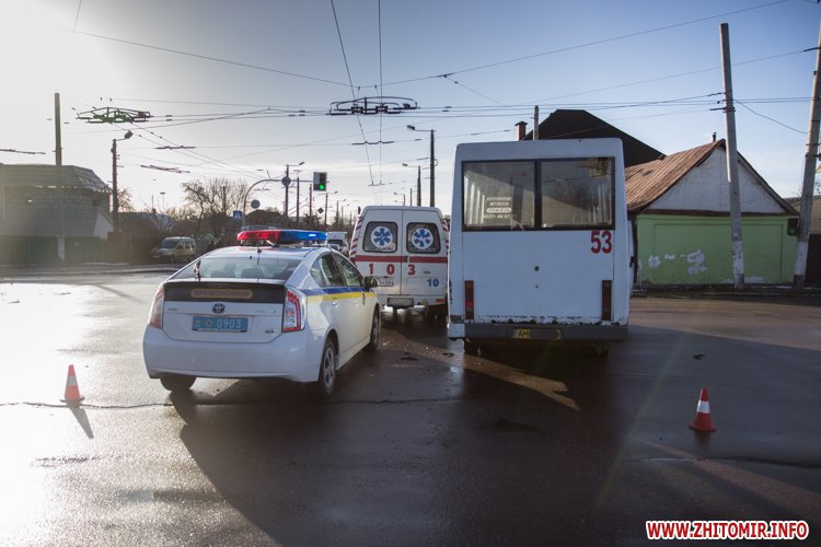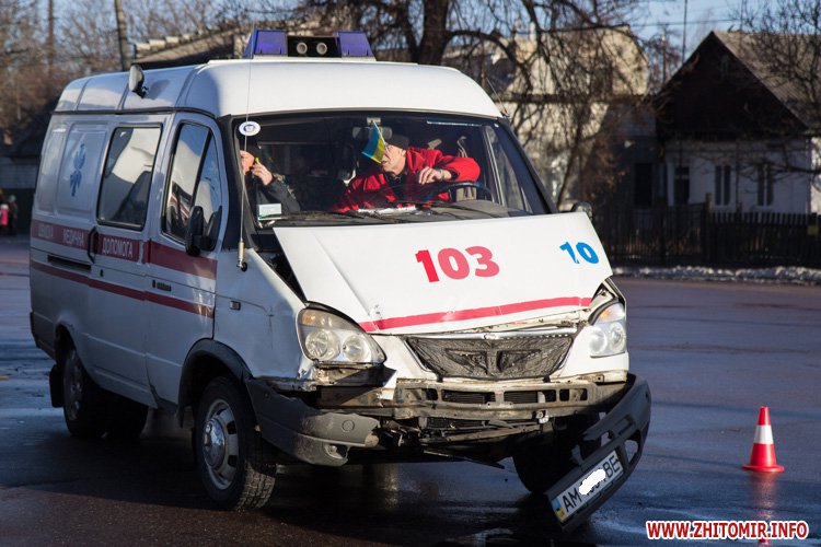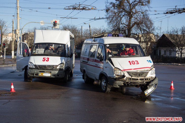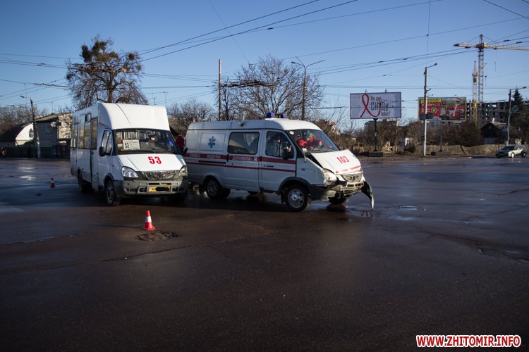 Утром 11 января в Житомире на регулируемом перекрестке машина «скорой помощи» столкнулась с маршрутным автобусом.