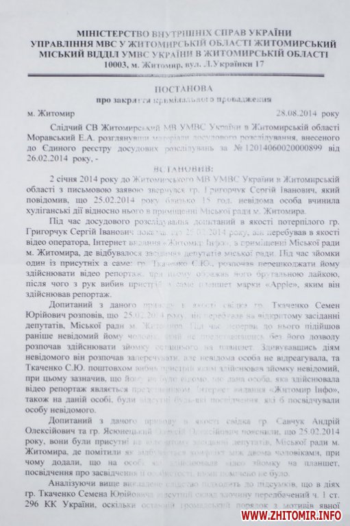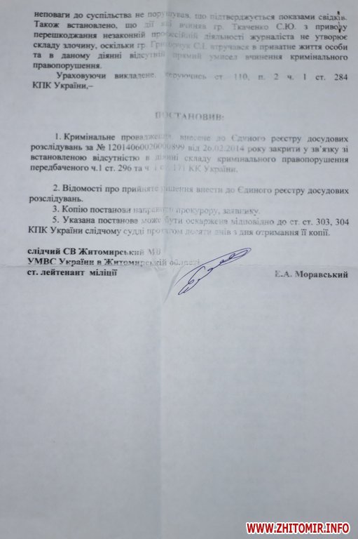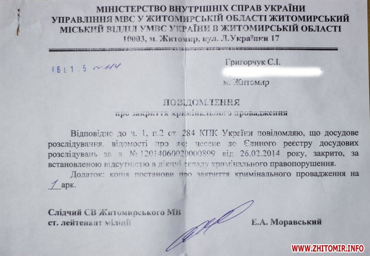 «Сообщаю, что досудебное расследование, информация о котором внесена в Единый реестр досудебных расследований под № 12014060020000899 от 26.02.2014 года, закрыто из-за установленного отсутствия в действиях состава уголовного правонарушения», - написал следователь Житомирского горотдела Э.А.Моравский.