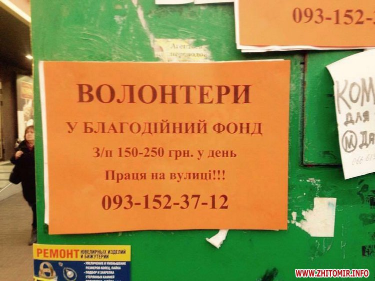 Как сообщал Житомир.info, летом прошлого года городской Центр социальных служб для семьи, детей и молодежи провел в Житомире исследование и выяснил, что деятельность волонтеров, работающих с ящиками на улицах города, одновременно нарушает несколько законов, а уличные сборщики денег «на лечение детей» получают зарплату – до 30% от собранной за день суммы.
