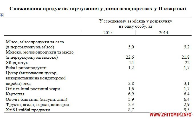 Так, у другому кварталі 2015 року населення спожило (у розрахунку на одну особу) менше м’яса, продуктів з нього та сала (в перерахунку на м’ясо), риби та рибопродуктів, цукру, олії та інших рослинних жирів, хлібобулочних виробів, овочів і фруктів.