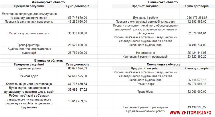 За даними ДП Prozorro, у Житомирській, а також сусідніх Рівненській, Хмельницькій та Вінницькій областях, найбільше закупівель відбувається саме в сфері будівництва. На відмінну від сусідів, у Житомирській області лідирують закупівлі електроапаратури, залізничних перевезень, автобусів та трансформаторів.