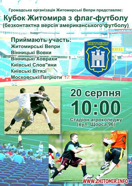 20 августа в Житомире уже 3-й год подряд состоится ежегодный Кубок Житомира по флаг-футболу (бесконтактная версия американского футбола). Турнир пройдет на стадионе Агро-экологического коллежда по адресу ул. Щорса, 96.