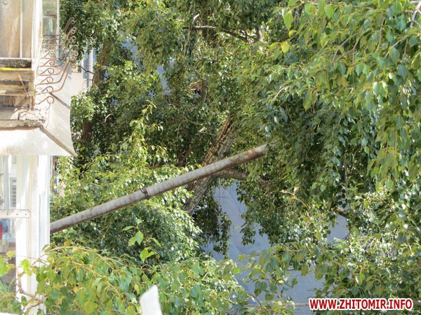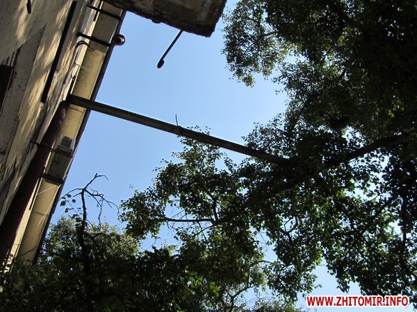 На уровне 4 этажа от времени и старости сломалась пополам водосточная труба. Держится на ветке дерева, малейший порыв ветра может сбросить ее на головы людей. Когда это случилось, никто не заметил, но жителей беспокоит возможные последствия: по тротуару оживленное движение, рядом – проезжая часть. Сейчас жители названивают в местные службы и выясняют, кто должен убрать «ржавую опасность» над головами людей….