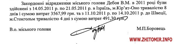 В ответе, который подписал заместитель мэра Николай Боровец сказано: «Заграничные командировки мэра Житомира Дебоя В.М. в 2011 году были совершены с 14.05 по 21.05 в Израиль, город Кирьят-Оно, продолжительностью 8 дней и суммой затрат 3567,99 грн. и с 10.11 по 14.11 в Швецию, город Стокгольм, продолжительностью 4 дня с суммой затрат 491,30 грн.».