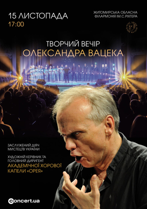 Житомирська обласна філармонія ім. С. Ріхтера запрошує 15 листопада о 17:00 на творчий вечір заслуженого діяча мистецтв України, диригента, композитора, педагога та керівника академічної хорової капели “Орея” — Олександра Вацека. Це унікальна подія, присвячена багаторічній творчій діяльності Маестро, який став справжнім символом сучасного українського хорового мистецтва. Під його керівництвом “Орея” здобула 9 Гран-прі та понад 40 перших місць на міжнародних конкурсах, прославивши Україну на сценах Європи та світу.