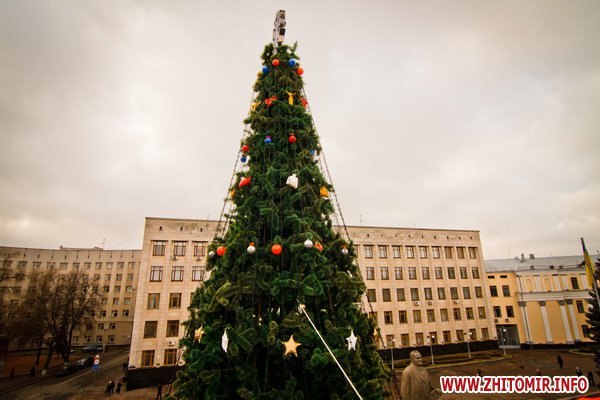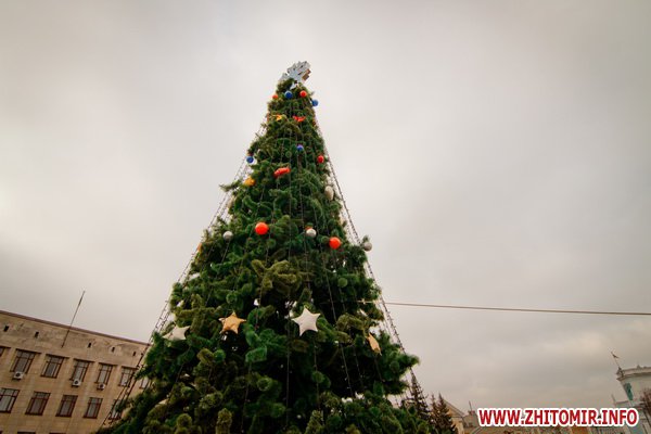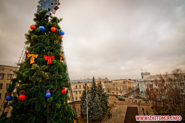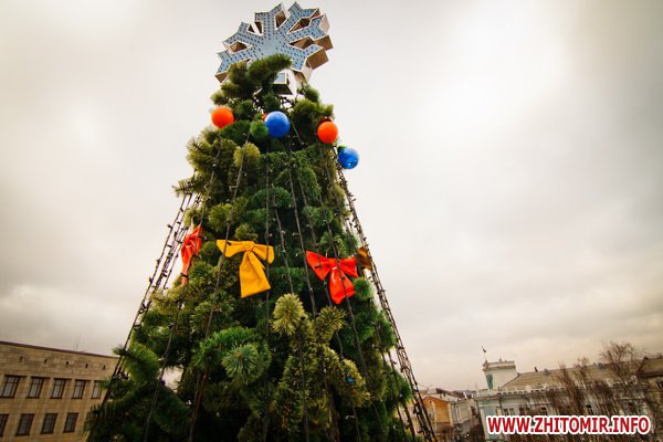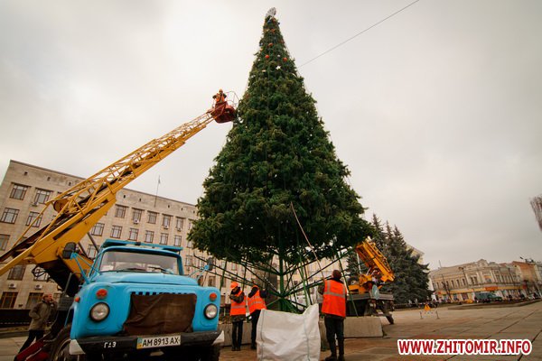 В центре Житомира, 14 декабря, начали украшать главную новогоднюю елку города, которую уже неделю устанавливают на площади Королева.