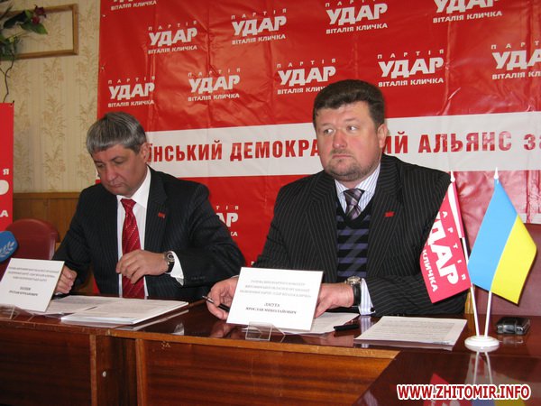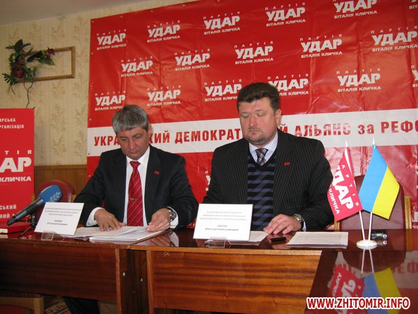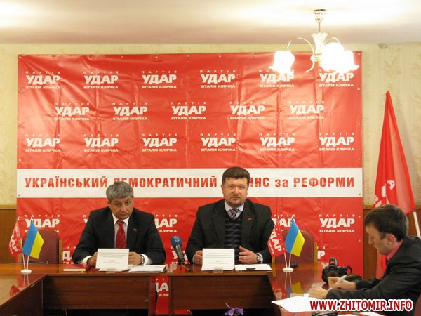 18 січня 2012 року в Житомирі відбулася прес-конференція Житомирської обласної організації ПП «Удар Віталія Кличка» щодо підписання угоди про взаємну співпрацю під час виборів до Верховної Ради України і створення демократичної більшості в мажоритарних округах регіонів.