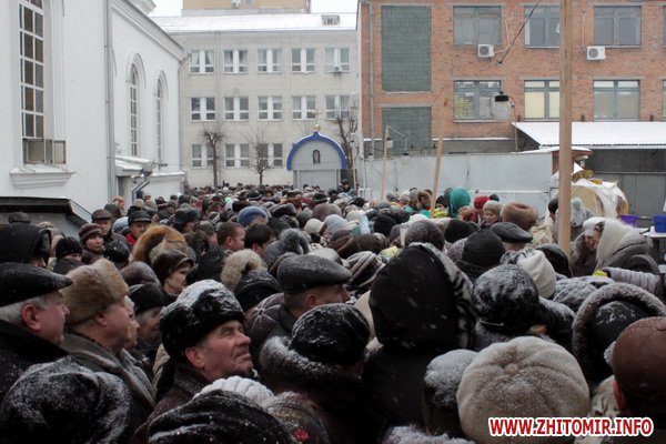 Сотні людей зібралися під станми Свято-Михайлівського собору у Житомирі аби набрати освячену воду на Водохреща 19 січня.