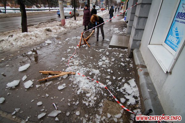В Житомире, 2 марта, с пятиэтажного дома упала огромная глыба льда. По слова очевидцев, лед упал с дома, который находится по адресу Киевская, 66, рядом с остановкой. Люди говорят, что повезло, что там никто в этот момент не стоял и не проходил.