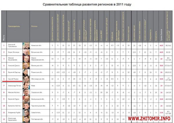 По итогам 2011 года губернатор Житомирской области Сергей Рыжук занял 6 место.
