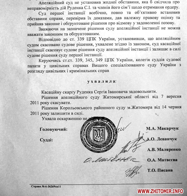 Напомним, что в январе 2011 года прокурор Житомира обратился в суд с исковым заявлением, в котором просил суд признать незаконным решение исполкома о выделении квартиры архитектору. Решением Королевского суда от 14 июня 2011 года в удовлетворении иска было отказано. Именно это решение теперь имеет законную силу.