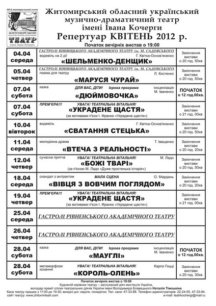 Житомирский театр представит в апреле всего 9 постановок, из которых будет показано 2 спектакля для детей, - сообщает Афиша Житомира
