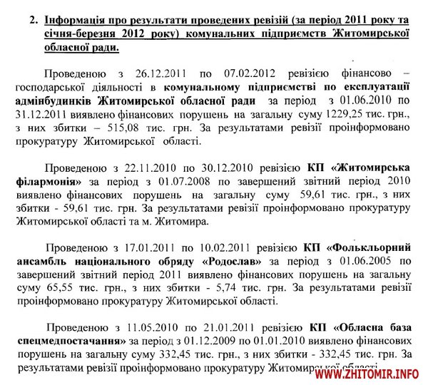 Так, во время ревизии финансово-хозяйственной деятельности КП по эксплуатации админзданий Житомирского облсовета за период с 1.06.2010г. по 31.12.2011г. обнаружены финансовые нарушения на общую сумму 1229,25 тыс.грн., из них убытки – 515,08 тыс.грн.