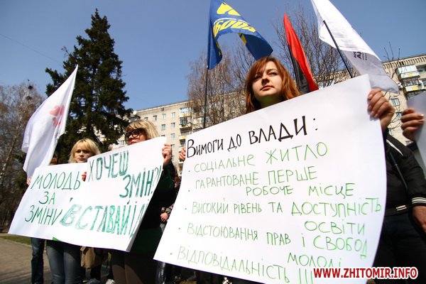 У Житомирі молодіжні осередки політичних та громадських організацій "Фронту Змін", "Батьківщини" та "Свободи" обєдналися у молодіжний рух "Вставай", аби відстоювати права молоді.