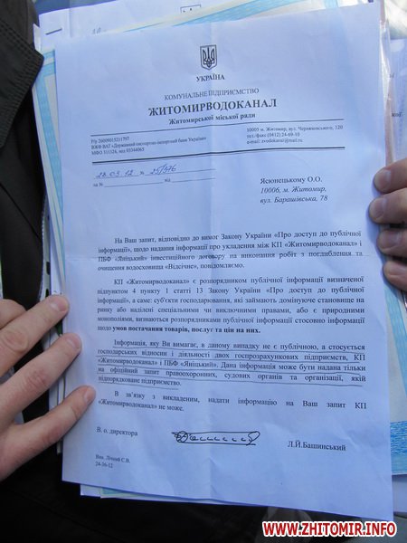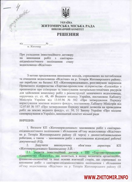 На заседании исполкома Житомирского горсовета 18 апреля заместитель мэра Николай Боровец предложил в повестку дня вопрос «О подписании инвестиционного договора на выполнение работ по санитарно-эпидемиологическому улучшению состояния водохранилища «Видсичне».