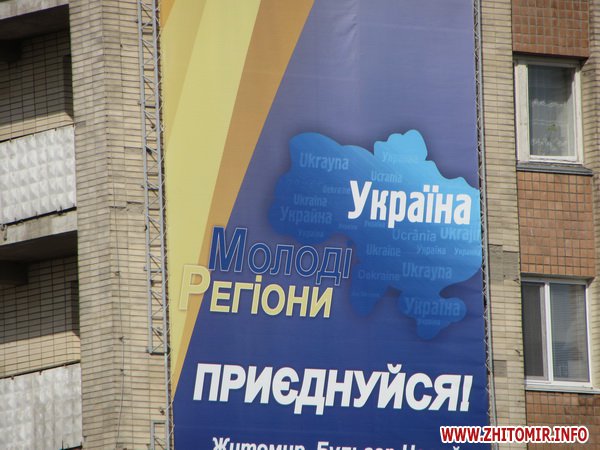 На площади Соборной, в центре Житомира висит гигантская реклама «Молодых Регионов».