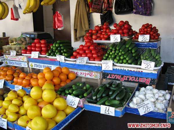 На рынке редис стоит от 10 до 16 грн, молодая капуста – 13 грн., они в основном поставляются из Николаева. Стоимость огурцов – от 11 до 22 грн., дешевле те, которые имеют нестандартный вид и размер. Огурцы поставляют в основном из Херсона и из села Станишовки под Житомиром. Помидоры стоят в среднем 20-25 грн., на рынок они попадают из Турции, Умани и Калиновки. Перец стоит 35 грн. за килограмм, лимоны – 16 грн., апельсины – 12-15 грн, бананы – около 15 грн.