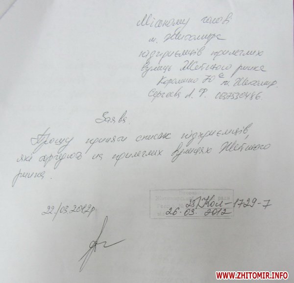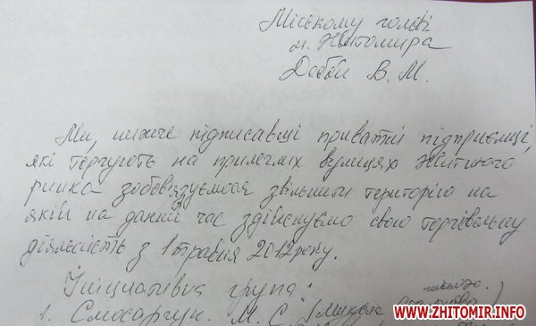 Наталия Леонченко показала журналисту Житомир.info заявление торговцев на имя мэра, датированное 22 марта. 166 человек, подписавших это заявление, соглашаются прекратить свою нелегальную торговую деятельность с 1 мая 2012 года.