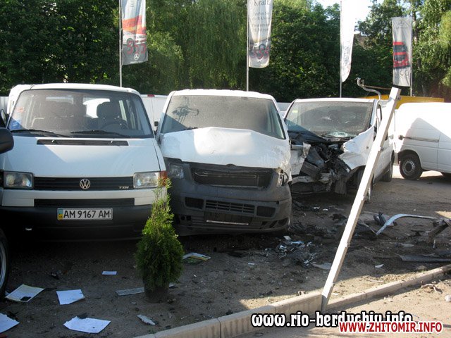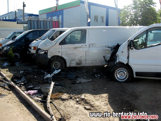 В Бердичеве автомобиль съехал с дороги, снес два забора и протаранил три буса, выставленных на продажу