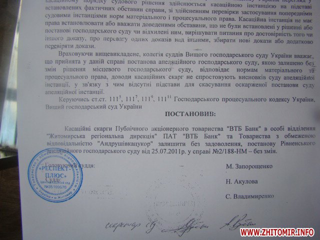 Вслед за отказом Хозяйственного суда Житомирской области, подобное решение было вынесено и апелляционной инстанцией – Ровенским Апелляционным судом, а затем и Высшим хозяйственным судом Украины. Согласно постановлению Высшего хозяйственного суда Украины от 20 декабря 2011 года было принято решение оставить без изменений Постановление Ровенского апелляционного суда и отказать банку в удовлетворении иска о признании публичного аукциона по реализации арестованного имущества ООО «Андрушівкацукор» недействительным. Это постановление является окончательным и обжалованию не подлежит.