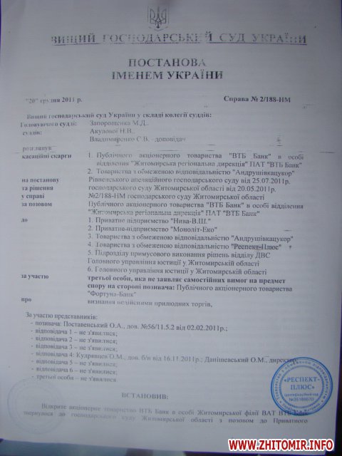 В мае 2010 года Хозяйственный суд Житомирской области отказал в удовлетворении данного иска. Но, не смотря на решение суда, сотрудники банка и охранники сахарного завода не допустили представителей ООО «Респект Плюс» на территорию предприятия, где находилось имущество, которое они выиграли на торгах, и являются законными владельцами, согласно постановления суда.